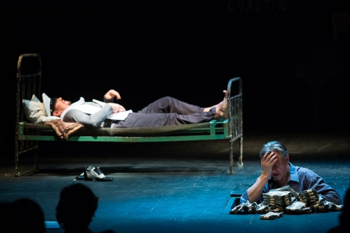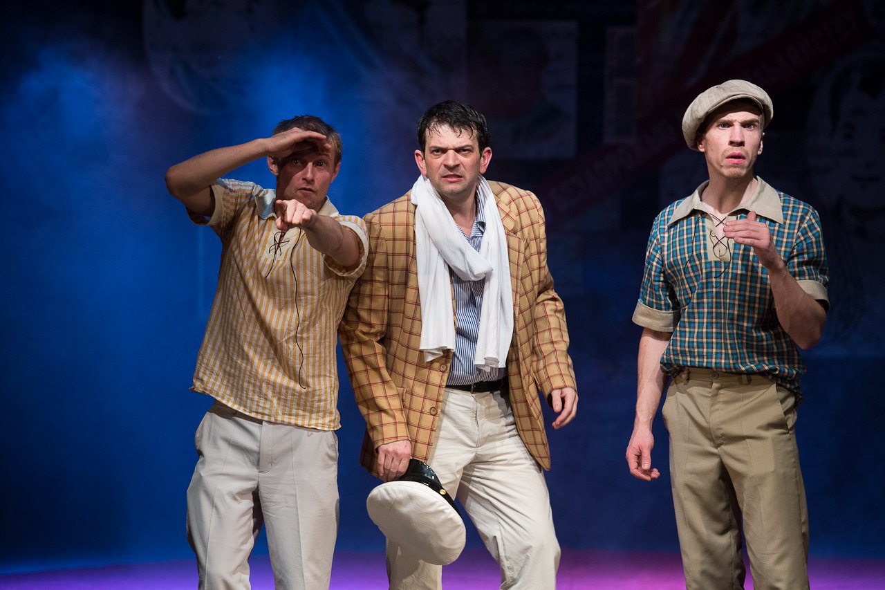 Версию культового романа "Золотой теленок" с подзаголовком "Концерт замученных опечаток" предложил новосибирский драматический театр "Старый дом". В прологе режиссер Тимур Насиров читает дневники Ильфа-Петрова, задавая тон спектаклю. В программке сказано, что он играет Козлевича (по настроению), но с таким настроением только дневники и читать. Печальная интонация не предвещает персонажам ничего хорошего, но найдет свое подтверждение лишь в финале. До поры до времени жизнь кажется славной и беззаботной. По залу бегают комсомольцы, музыканты, матросы, психи, а на сцене творится форменное хулиганство, которым заправляют четыре Бендера, – то одновременно, то поочередно. Разобраться в том, кто из них настоящий, а кто самозванец, гораздо труднее, чем идентифицировать детей лейтенанта Шмидта. Впрочем, необходимости в этом нет, так как главный герой спектакля, как было задумано, вовсе не Бендер.