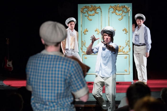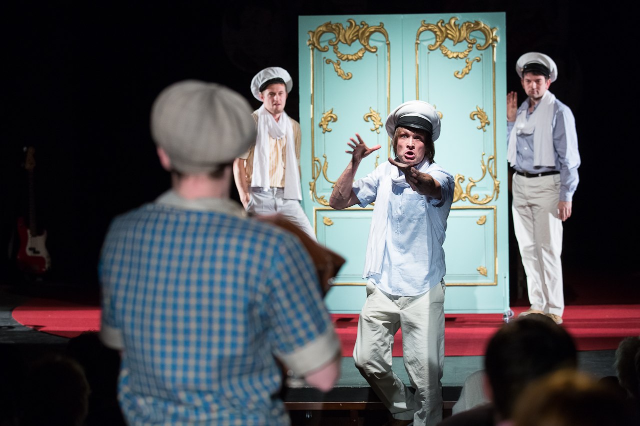 Закон, по которому Тимур Насиров предлагает судить свой спектакль, он сформулировал в анонсах четко и определенно. Спектакль сделан для читателей "Золотого теленка", растащивших роман на цитаты, знающих его чуть ли не наизусть. Посему главный герой здесь – текст, великий и могучий. Актеры предлагают перечитать его вместе, насладиться им, поиграть с ним, на наших глазах придумывая соответствующие духу текста ситуации. На темно-бордовый круг, напоминающий арену цирка, выкатывают рояль, в котором нет ни струн, ни клавиш, потому что на самом деле он – Антилопа-гну, а потом еще и комод, в котором Корейко хранит противогазы. Музыка извлекается из менее академических инструментов: аккордеон, труба, тарелки, бубен, стиральная доска с грифом гитары. Паниковский вполне сносно играет на банджо, дирижируют джаз-бандой Бендеры в шарфах и кепках. Звучат популярные песни и мелодии 30-х и прочих годов, а в танго Пьяццоллы вступают воображаемые скрипки.