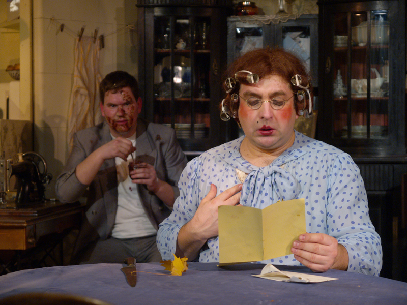 Влюбленная Соня для рассказчика – предмет особо смачных насмешек. Спектакль Нового рижского театра тем дальше уходит от хоть какого-то намека на комедию с переодеваниями, чем наглее рассказчик упивается сониным идиотизмом. Сначала в припадке веселья падает лицом в торт, да так и остается измазанный кремом, подобно пошлому клоуну. Потом падает со стула и едва ли не катается по полу, так ему прикольно от того, что Соня поддалась уморительному розыгрышу с несуществующим Николаем.