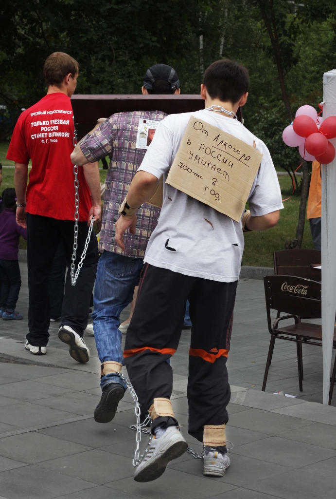 Правда, среди юного поколения все больше появляется умников, для которых не зазорно пропагандировать здоровый образ жизни. Может, кто видел на Дне города в Новосибирске уличный перформанс: шествие чудаков с плакатами, в цепях и колодках, символизирующих добровольное заключение в пивное рабство. Им было весело и в трезвом состоянии.